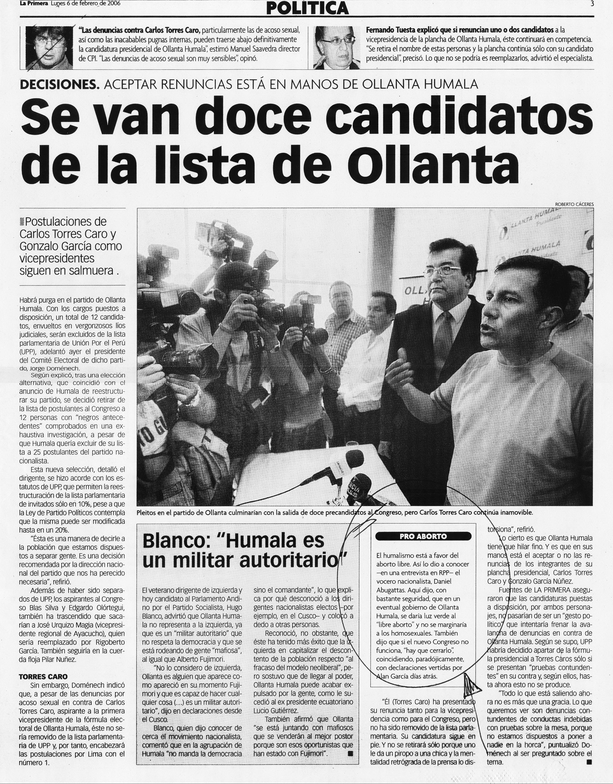 La primera Lista de ollantab 06022006 Pag 3 227x300 Humala: El lobo abortistaPrimeramente está Daniel Abugatás, que ahora va con el número 1 de Gana Perú al Congreso. Abugatás Se ha manifestado públicamente a favor del aborto en reiteradas oportunidades como pueden ver en la siguiente noticia del diario La Primera el 6 de febrero del 2006, señala que en un eventual gobierno de Humala “se daría luz verde” al “libre aborto”.