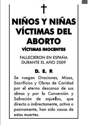 En la esquela, que se titula Niños y niñas víctimas del aborto. Víctimas inocentes. Fallecieron en España durante el año 2009, se puede leer el siguiente texto: “Se ruegan oraciones, misas, sacrificios y obras de caridad por el eterno descanso de sus almas y por la conversión y salvación de aquellos que, directa o indirectamente, activa o pasivamente, han sido causa de estas muertes”.