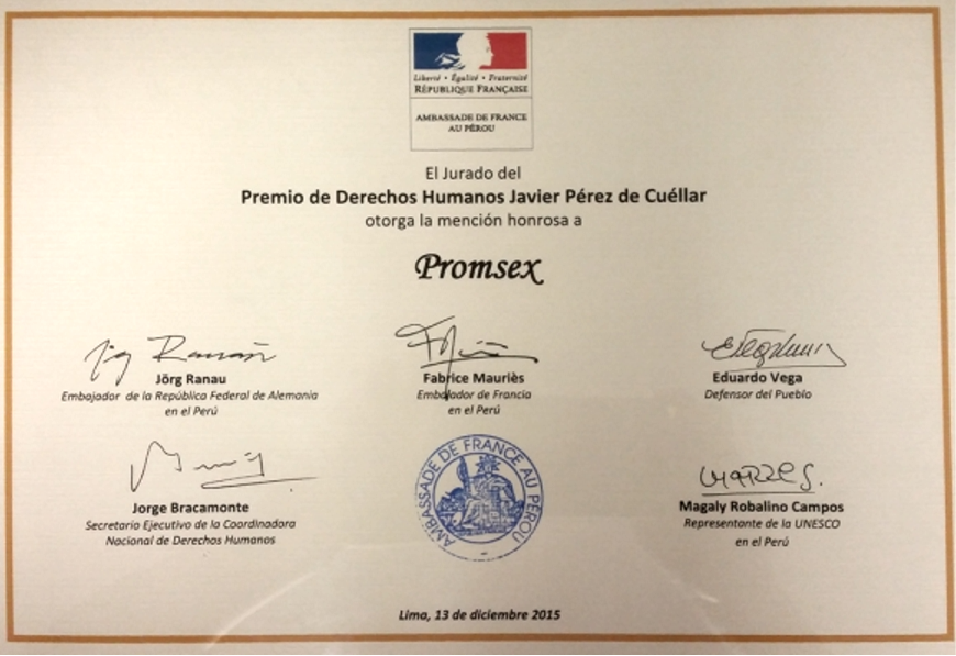 Mencion honrosa Promsex Premio JPC1 Embajada de Francia: Mención honrosa a ONG pro aborto Promsex por demandar al Perú ante comité de la ONU