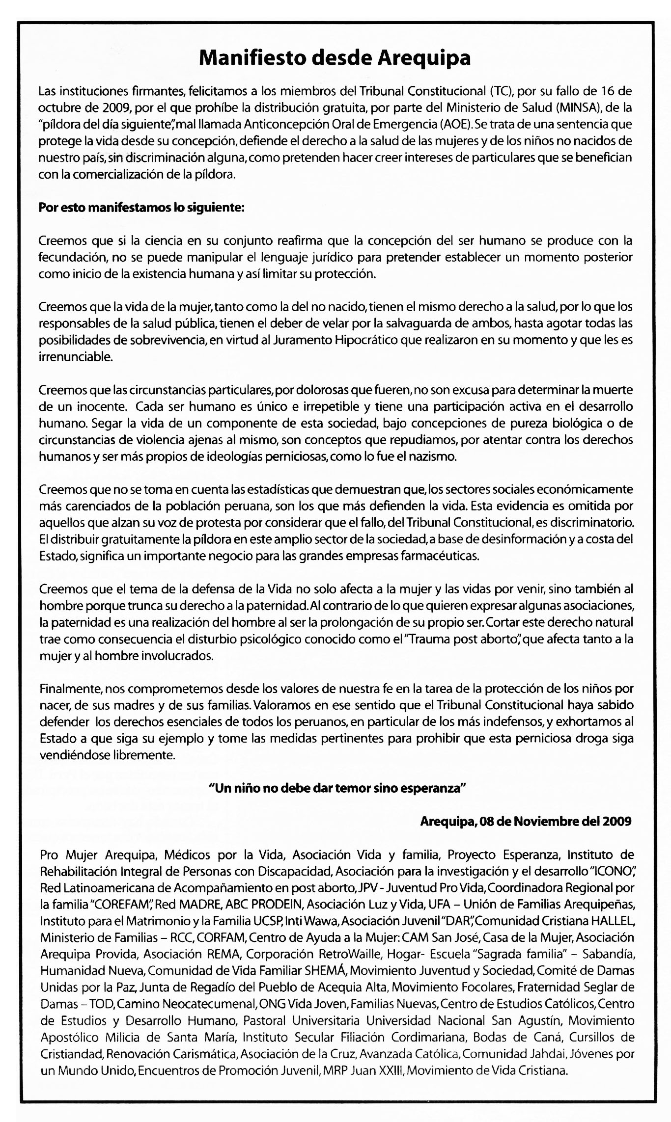 El día domingo 15 en el diario La República en la página 5 salió publicado a nivel nacional un manifiesto por la vida firmado por ONG´s , ONG´s provida y asociaciones católicas. En éste se pone énfasis en los siguientes puntos: